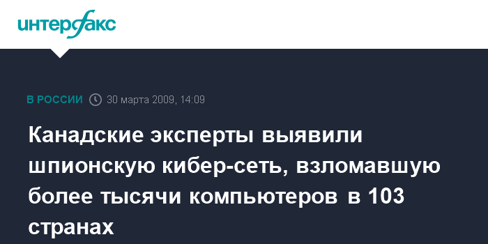Москва. 30 марта. INTERFAX.RU - Шпионская кибер-сеть, контролируемая, как предполагается из Китая, уже взломала и похитила секретные документы из правительственных и частных компьютеров 103 стран, пишет британская газета "Таймс" в понедельник со ссылкой на данные исследователей канадской организации "Информэйшн Уорфэр Монитор" (ИУМ).