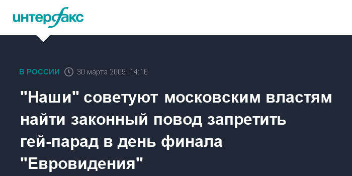 Москва. 30 марта. INTERFAX.RU - Попытка провести гей-парад в Москве в день финала международного конкурса "Евровидение" - это провокация против России, заявляют в молодежном движении "Наши".