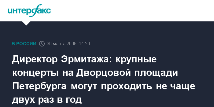 Пиотровский подчеркнул, что по данным исследований, проведенных музеем, крупные концерты могут проводиться на Дворцовой площади один-два раза в год. "У нас нет крупного стадиона, поэтому, не чаще двух раз в год, подобные мероприятия могут проходить на главной площади города без ущерба памятникам и Эрмитажу", - сказал директор музея.