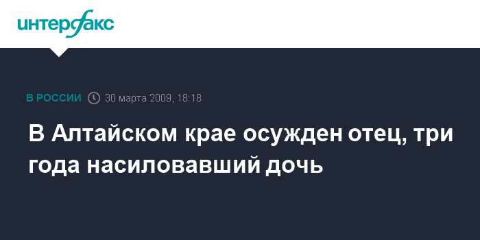 Барнаул. 30 марта. INTERFAX.RU - Житель Романовского района Алтайского края приговорен к 9 годам лишения свободы за то, что в течение трех лет насиловал свою несовершеннолетнюю дочь.