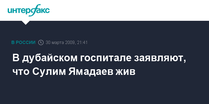 Москва. 30 марта. INTERFAX.RU - Как сообщил в понедельник вечером Первый телеканал, дубайская больница дала информацию о том, что Сулим Ямадаев жив, хотя и находится в тяжелом состоянии.