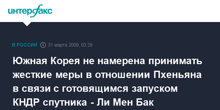 Пекин. 31 марта. ИНТЕРФАКС-КИТАЙ - Сеул не планирует принятие каких-либо санкций в отношении КНДР в связи с запланированным Пхеньяном запуском искусственного спутника Земли, заявил президент Южной Кореи Ли Мен Бак.