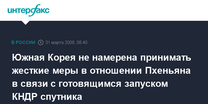 Москва. 31 марта. INTERFAX.RU - Сеул не планирует принятие каких-либо санкций в отношении КНДР в связи с запланированным Пхеньяном запуском искусственного спутника Земли, заявил президент Южной Кореи Ли Мен Бак.
