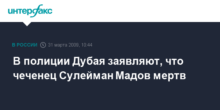 Москва. 31 марта. INTERFAX.RU - Полиция Дубая назвала не соответствующими действительности сообщения некоторых СМИ о том, что чеченец Сулейман Мадов, на которого было совершено покушение, жив, сообщает базирующаяся в ОАЭ газета "Галф ньюс".