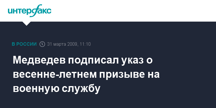 Москва. 31 марта. INTERFAX.RU - Президент России Дмитрий Медведев подписал указ "О призыве в апреле-июле 2009 г. граждан РФ на военную службу и об увольнении с военной службы граждан, проходящих военную службу по призыву", сообщает пресс-служба главы государства во вторник.