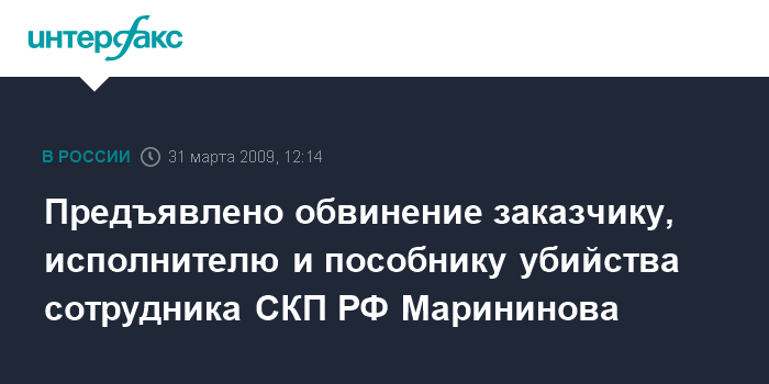 Москва. 31 марта. INTERFAX.RU - Заказчик, исполнитель и пособник убийства сотрудника СКП РФ Дмитрия Марининова арестованы, всем троим предъявлено обвинение, сообщил "Интерфаксу" во вторник источник в правоохранительных органах Петербурга.