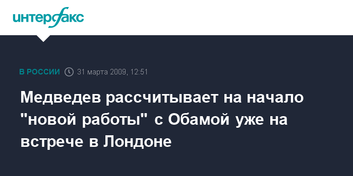 "Для начала мы должны согласиться, что преодолеть негативное наследие прошлого возможно только путем обеспечения взаимной и равной выгоды и принимая во внимание наши взаимные интересы. Я готов к работе с президентом Обамой на основе этих принципов, и я надеюсь, что мы начнем уже завтра, на нашей первой встрече в Лондоне перед открытием саммита "большой двадцатки", - сказал Медведев в статье, опубликованной во вторник в газете Washington Post.
