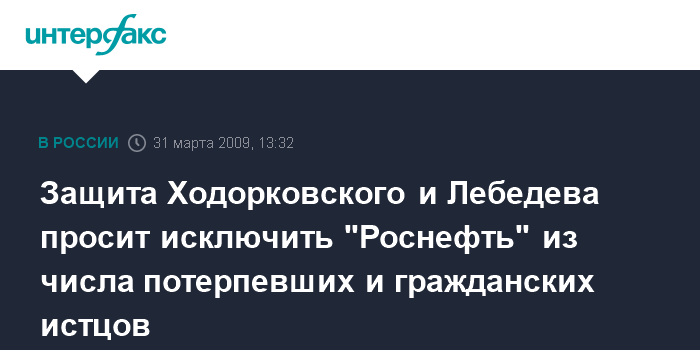 Москва. 31 марта. INTERFAX.RU - Адвокаты Михаила Ходорковского и Платона Лебедева просят устранить от участия в новом судебном процессе потерпевших и гражданских истцов - компанию "Роснефть" и Федеральное агентство по управлению госимуществом (бывшее РФФИ).