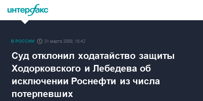Москва. 31 марта. INTERFAX.RU - Хамовнический суд Москвы отказался исключить из числа потерпевших и гражданских лиц "Роснефть" и Федеральное агентство по управлению госимуществом РФ по второму уголовному делу в отношении экс-главы НК "ЮКОС" Михаила Ходорковского и бывшего главы МФО "МЕНАТЕП" Платона Лебедева.
