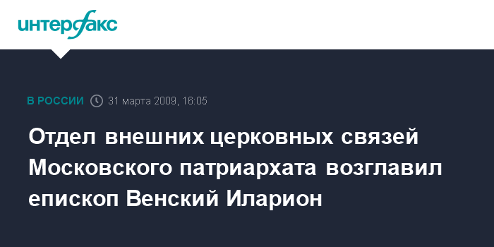Москва. 31 марта. INTERFAX.RU - Священный Синод Русской православной церкви на заседании во вторник назначил председателем Отдела внешних церковных связей епископа Венского и Австрийского Илариона.