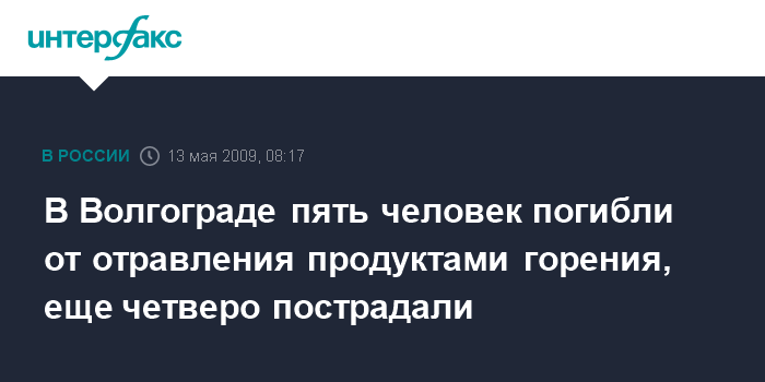 Москва. 13 мая. INTERFAX.RU - В Волгограде в четырехэтажном доме номер 42 на улице Олимпийская от отравления продуктами горения погибли пять человек, в том числе ребенок. Еще четверо, в том числе годовалый ребенок, находятся в реанимации, сообщили агентству "Интерфакс-Юг" в правоохранительных органах города.