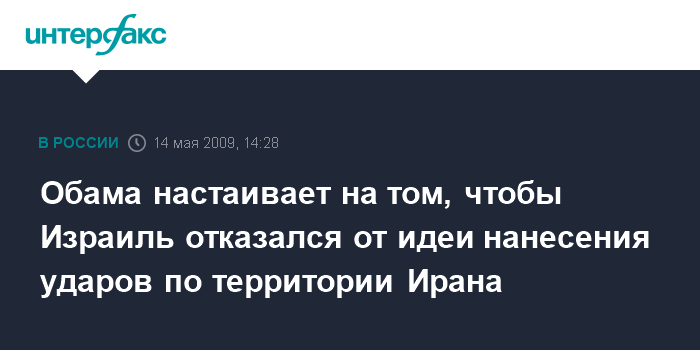 Москва. 14 мая. INTERFAX.RU - Президент США Барак Обама обратился к властям Израиля с просьбой воздержаться от нанесения неожиданных ударов по территории Ирана, пишет в четверг газета "Гаарец". По ее информации, Обама направил послание премьер-министру Израиля Биньямину Нетаньяху, в котором говорится, что израильским военным не следует "преподносить сюрприз Вашингтону, проводя военную операцию против Ирана".