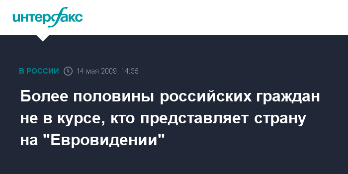 Москва. 14 мая. INTERFAX.RU - Большинство россиян (71%) знают о том, что музыкальный конкурс "Евровидение" в этом году проходит в Москве, однако до сих пор более половины граждан не знают, кто представляет Россию, показывают исследования социологов.