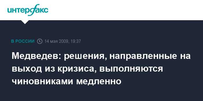 Киров. 14 мая. INTERFAX.RU - Президент РФ Дмитрий Медведев критикует чиновников за медлительность при выполнении решений, в том числе направленных на выход из кризиса.