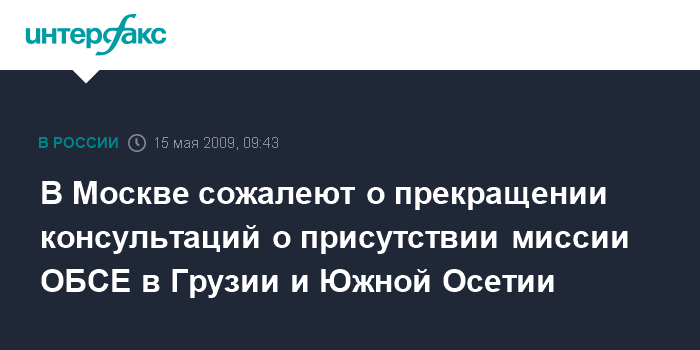 Москва. 15 мая. INTERFAX.RU - Отказ от дальнейших консультаций по присутствию военных наблюдателей от ОБСЕ на территории Грузии и Южной Осетии ведет к прекращению миссии Организации в этом районе, заявляют в МИД РФ.