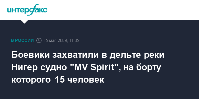 Москва. 15 мая. INTERFAX.RU - Посольство Украины в Нигерии подтверждает обнародованную в СМИ информацию о захвате боевиками 14 мая с.г. в дельте реки Нигер судна "MV Spirit" с 15 иностранными гражданами на борту.