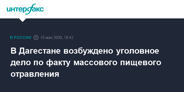 Махачкала. 15 мая. INTERFAX.RU - В больницу города Буйнакска в Дагестане с диагнозом "пищевое отравление" доставлены 23 человека, возбуждено уголовное дело.