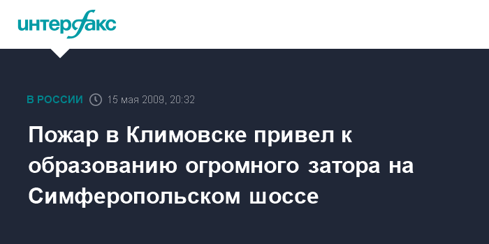 Москва. 15 мая. INTERFAX.RU - В результате пожара в подмосковном городе Климовск в районе Симферопольского шоссе образовалась огромная "пробка", сообщил "Интерфаксу" источник в правоохранительных органах.