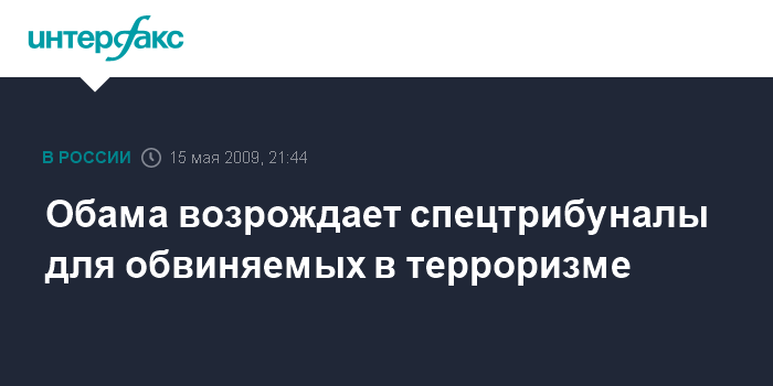 Вашингтон. 15 мая. INTERFAX.RU - Президент США Барак Обама в пятницу объявил о возобновлении работы специальных трибуналов для проведения процессов над некоторыми обвиняемыми в терроризме, заключенными сейчас в центре задержаний на американской военной базе в Гуантанамо.