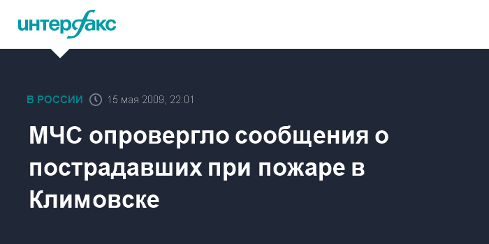Москва. 15 мая. ИНТЕРФАКС - В результате пожара на складе ФГУП "Почта России" в подмосковном городе Климовске погибших и пострадавших нет, сообщили "Интерфаксу" в центральном региональном центре (ЦРЦ) МЧС России в пятницу.