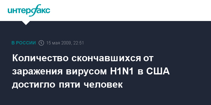 Вашингтон. 15 мая. ИНТЕРФАКС - Пятый летальный исход вследствие заражения вирусом гриппа H1N1 зафиксирован в США.
