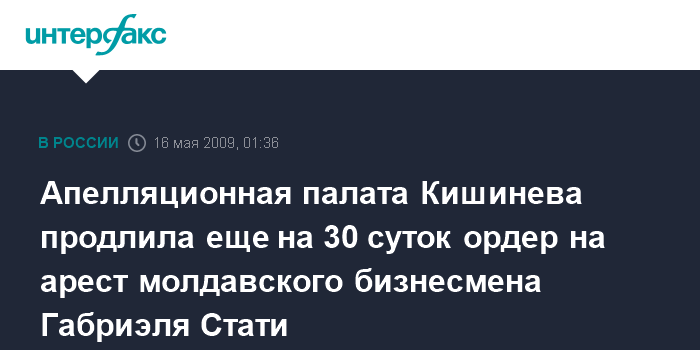 Кишинев. 16 мая. ИНТЕРФАКС - Апелляционная палата Кишинева продлила еще на 30 суток ордер на арест известного молдавского бизнесмена Габриэля Стати. Решение вынесено поздно вечером в пятницу по требованию Генеральной прокуратуры Кишинева, которая обвиняет Г.Стати и его охранника Аурела Маринеску в попытке узурпации власти и организации массовых беспорядков.