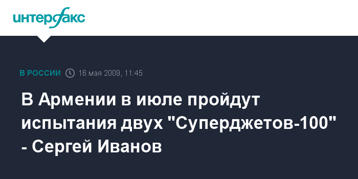 Москва. 16 мая. INTERFAX.RU - В конце 2009 - начале 2010 года самолеты "Сухой Суперджет-100" будут поставлены в Армению, сообщил вице-премьер РФ Сергей Иванов.