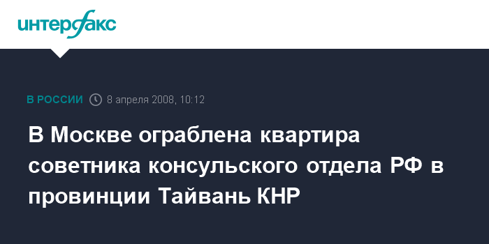 Москва. 8 апреля. INTERFAX.RU - В Западном округе столицы ограблена квартира консула-советника консульского отдела РФ в провинции Тайвань КНР, сообщил "Интерфаксу" во вторник источник в правоохранительных органах.