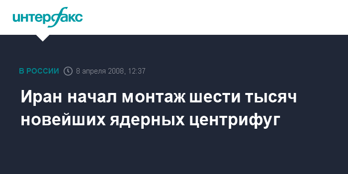 Тегеран. 8 апреля. INTERFAX.RU - В Иране начаты работы по установке 6 тыс. центрифуг нового поколения, которые позволят республике значительно продвинуться развитии национальной ядерной программы, заявил президент страны Махмуд Ахмадинежад, выступая в городе Натанц по случаю отмечаемого во вторник в Иране дня ядерных технологий.