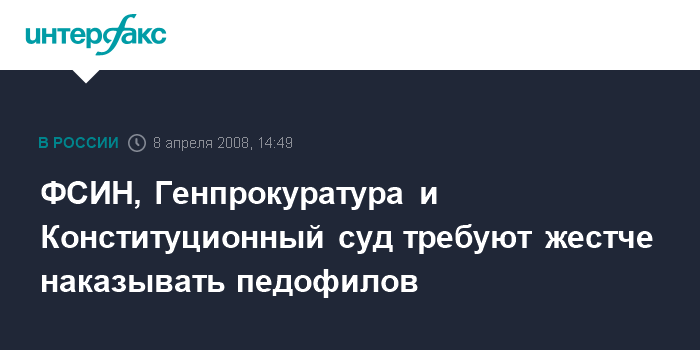 Москва. 8 апреля. INTERFAX.RU - Начальник правового управления Федеральной службы исполнения наказаний РФ Олег Филимонов считает, что нужно ужесточить наказания за сексуальные преступления в отношении несовершеннолетних.