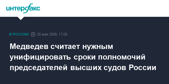 Москва. 20 мая. INTERFAX.RU - Президент России Дмитрий Медведев намерен дополнить свой законопроект о порядке назначения председателя Конституционного суда (КС) с тем, чтобы унифицировать срок полномочий глав высших судебных органов страны.