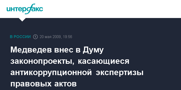 Москва. 20 мая. INTERFAX.RU - Президент России Дмитрий Медведев внес в Госдуму проекты федеральных законов "Об антикоррупционной экспертизе нормативных правовых актов и проектов нормативных правовых актов" и "О внесении изменения в федеральный закон "О прокуратуре РФ", сообщила пресс-служба Кремля.