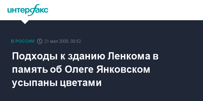Москва. 21 мая. INTERFAX.RU - Россияне усыпали цветами тротуар рядом со зданием театра "Ленком" на Малой Дмитровке в Москве в память о народном артисте СССР Олеге Янковском, передает корреспондент "Интерфакса" в четверг.
