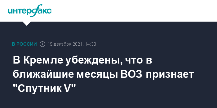 Москва. 19 декабря. INTERFAX.RU - В Кремле убеждены, что решение вопросов, связанных с одобрением российской вакцины от коронавируса "Спутник V" в ВОЗ и Европе, произойдет в ближайшие месяцы.