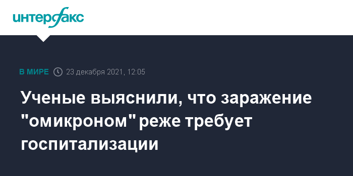Москва. 23 декабря. INTERFAX.RU - Заражение штаммом коронавируса "омикрон" значительно снижает риск госпитализации для человека по сравнению с другими штаммами, сообщает Bloomberg со ссылкой на несколько недавних исследований.