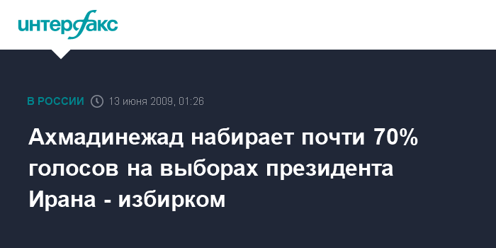 По данным избиркома, М.Ахмадинежад набирает 69% голосов, у его ближайшего соперника, бывшего премьер Ирана Мира Хоссейна Мусави пока 28% голосов.