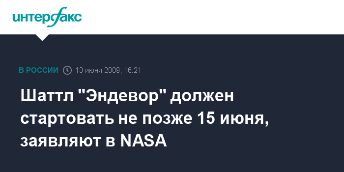 Москва. 13 июня. INTERFAX.RU - Американский шаттл "Эндевор" должен стартовать к Международной космической станции не позже понедельника, в ином случае запуск будет перенесен на более поздний срок, сообщил "Интерфаксу-АВН" в субботу представитель NASA в подмосковном Центре управления полетами Сергей Пузанов.