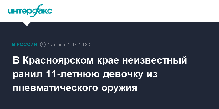 Москва. 17 июня. INTERFAX.RU - Красноярские милиционеры разыскивают неизвестного, ранившего 11-летнюю девочку из пневматического оружия, когда она играла в районе местного стадиона. Как сообщает пресс-служба краевого ГУВД, накануне в поселке Кедровый 11-летняя девочка была доставлена в больницу с проникающим ранением брюшной полости.