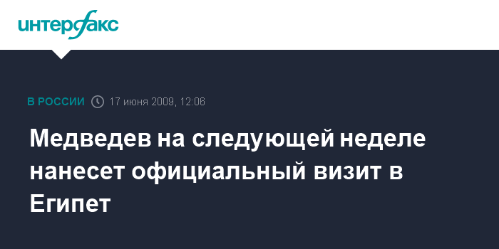 Москва. 17 июня. ИНТЕРФАКС - Президент России Дмитрий Медведев совершит официальный визит в Арабскую Республику Египет 23-34 июня 2009 г., сообщает в среду пресс-служба главы государства