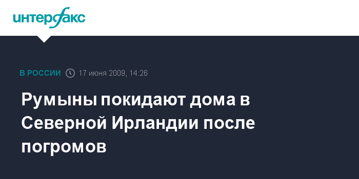 Лондон. 17 июня. INTERFAX.RU - Более 100 румынов, в числе которых пятидневный младенец, взяты под опеку церкви после того, как они были вынуждены покинуть свои дома из-за волны расистских погромов в Белфасте (Северная Ирландия), сообщает в среду британская телекомпания Sky News.