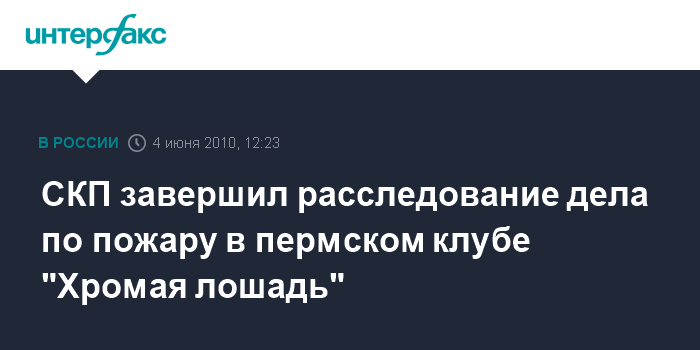 Москва. 4 мая. INTERFAX.RU – СКП РФ завершил расследование уголовного дела, возбужденного по факту пожара в пермском клубе "Хромая лошадь", сообщил "Интерфаксу" официальный представитель СКП РФ Владимир Маркин.