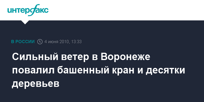 Москва. 4 июня. INTERFAX.RU - В Воронеже ураганный ветер утром в пятницу повалил башенный кран и деревья, сообщил "Интерфаксу" представитель городского управлении ГО и ЧС. "Башенный кран рухнул на стройплощадке на Автогенном переулке 11а. Пострадавших нет", - сказал собеседник агентства. Кроме того, ветер повалил около 30 деревьев.