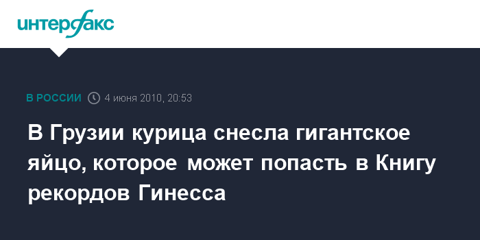 Тбилиси. 4 июня. INTERFAX.RU - Житель Зестафонского района Грузии Мурман Модебадзе утверждает, что его курица снесла самое большое яйцо в мире, и намерен претендовать на внесение яйца в Книгу рекордов Гинесса.