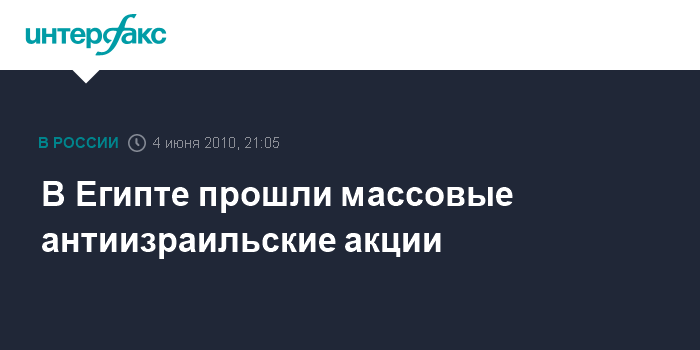 Каир. 4 июня. INTERFAX.RU - Несколько десятков тысяч египтян в пятницу приняли участие в акциях протеста в различных провинциях страны в связи с гибелью активистов пропалестинского конвоя, в минувший понедельник пытавшегося прорвать блокаду сектора Газа, сообщило в пятницу агентство ЭФЭ со ссылкой на источники в правоохранительных органах Египта.