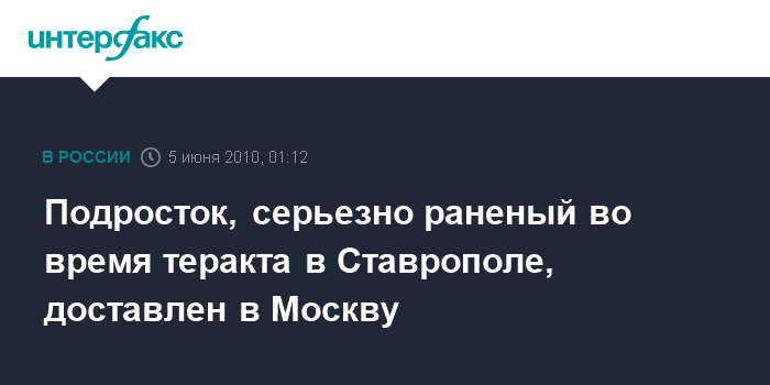 "Самолет Бе-200 МЧС России в 23:42 мск совершил посадку на аэродром "Раменское". Этим самолетом в Москву был доставлен 16-летний подросток, который получил тяжелые осколочные ранения ног в результате теракта в центре Ставрополя", - сообщили в субботу "Интерфаксу" в управлении информацией МЧС России.