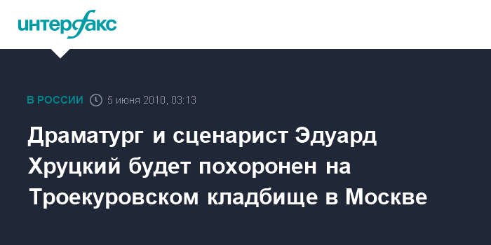 "Прощание с Э.Хруцким состоится 5 июня в Доме кино. После он будет похоронен на Троекуровском кладбище", - сообщили ранее "Интерфаксу" в Гильдии кинодраматургов Союза кинематографистов России.