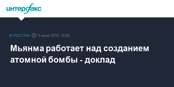 Лондон. 5 июня. INTERFAX.RU - Мьянма (Бирма) начала разработку собственного ядерного оружия, сообщает британская телерадиокорпорация Би-би-си со ссылкой на документы, представленные перебежчиком - бывшим майором вооруженных сил Мьянмы Сай Тейн Вином.