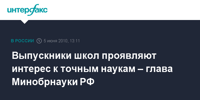 Москва. 5 июня. INTERFAX.RU - Данные о сдаче ЕГЭ свидетельствуют о возрастании интереса выпускников школ к точным наукам, заявил министр образования и науки РФ Андрей Фурсенко. "В этом году количество выпускников, которые сдают Единый государственный экзамен по таким предметам, как информатика, физика, химия, возросло. () Это означает, что та работа по профориентации, которую ведут и вузы, и правительство, не проходит зря, и ребята начинают в большей степени интересоваться точными науками, в перспективе - реальной экономикой", - сказал министр на встрече с главой правительства Владимиром Путиным.