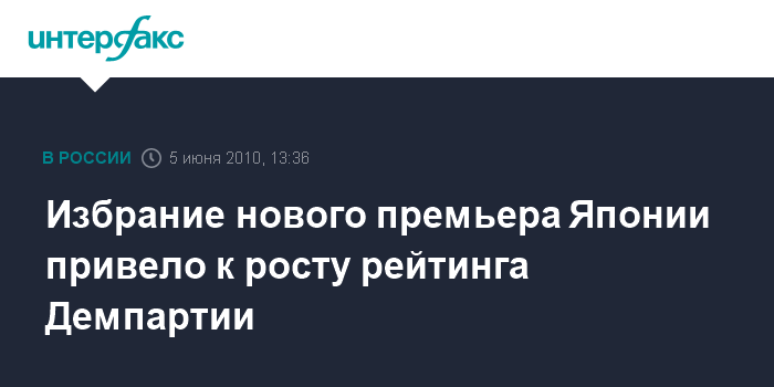 Лондон. 5 июня. INTERFAX.RU - Рейтинг правящей Демократической партии Японии резко вырос после выборов нового премьер-министра, которым стал бывший министр финансов Наото Кан, сообщает в субботу британская телерадиокорпорация Би-би-си. Согласно опросам общественного мнения, рейтинг партии вырос с 15,6% до 36,1%.