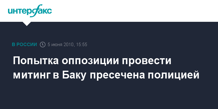 Баку. 5 июня. INTERFAX.RU - Полиция города Баку пресекла в субботу попытку оппозиционного блока "Азадлыг" ("Свобода") провести несанкционированную акцию, сообщает корреспондент агентства "Интерфакс-Азербайджан". Первоначально по планам оппозиция, митинг должен был состояться на площади перед станцией метро "Нариманова", однако позднее блок перенес акцию в окрестности станции метро "Ичеришехер". Отмечается, что исполнительная власть города Баку не санкционировала данную акцию и советовала провести ее в иных районах города.
